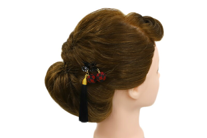 髪飾りのアクセントに付いている房が単品になって登場^^ 落ち着いた落ち着いた渋い赤色とシックな黒色の配色の格子柄の玉飾りのクリップと 黒色の房がプラスされたクリップがセットに^^ 可愛らしい黒の飾りクリップ付きで簡単装着♪
